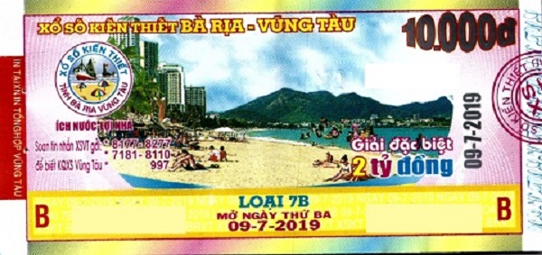 Công ty TNHH MTV Xổ số kiến thiết Bà Rịa - Vũng Tàu thông báo trả thưởng kỳ vé 7B mở thưởng ngày 9/7/2019.