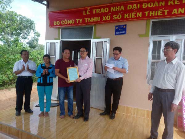 Ảnh: Ông Ngô Vũ Hải – Phó Giám đốc Công ty TNHH MTV Xổ số Kiến thiết An Giang trao Quyết định tặng nhà Đại đoàn kết cho hộ gia đình nhận nhà Đại đoàn kết.