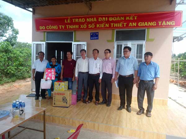 Ảnh: Ông Ngô Vũ Hải – Phó Giám đốc Công ty TNHH MTV Xổ số Kiến thiết An Giang và Bình Thuận và ban, ngành tặng quà mừng hộ gia đình nhận nhà Đại đoàn kết.