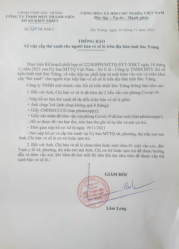 - Nộp hồ sơ làm "thẻ xanh" đủ điều kiện bán vé số gồm: Ảnh 3x4 chụp không quá 6 tháng; giấy CMND/CCCD (bản photocopy); giấy xác nhận đã tiêm vacine phòng Covid--19 đủ 2 mũi (bản photocopy).