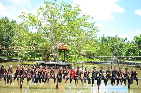 Đồng chí Trần Văn Lắm – Chủ tịch Công ty và đồng chí Trình Bảo Châu – Phó Giám đốc Công ty chụp hình lưu niệm cùng các Đoàn viên tại khu di tích lịch sử - văn hóa Căn cứ Vườn Mận