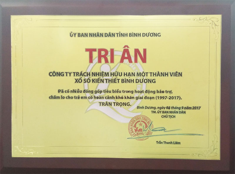Cũng trong dịp này, kỷ niệm 20 năm thành lập Quỹ Bảo trợ em tỉnh Bình Dương, Công ty đã được UBND tỉnh tặng biểu tượng Tri ân vì đã có nhiều đóng góp tiêu biểu trong hoạt động bảo trợ, chăm lo cho trẻ em có hoàn cảnh khó khăn giai đoạn 1997 – 2017