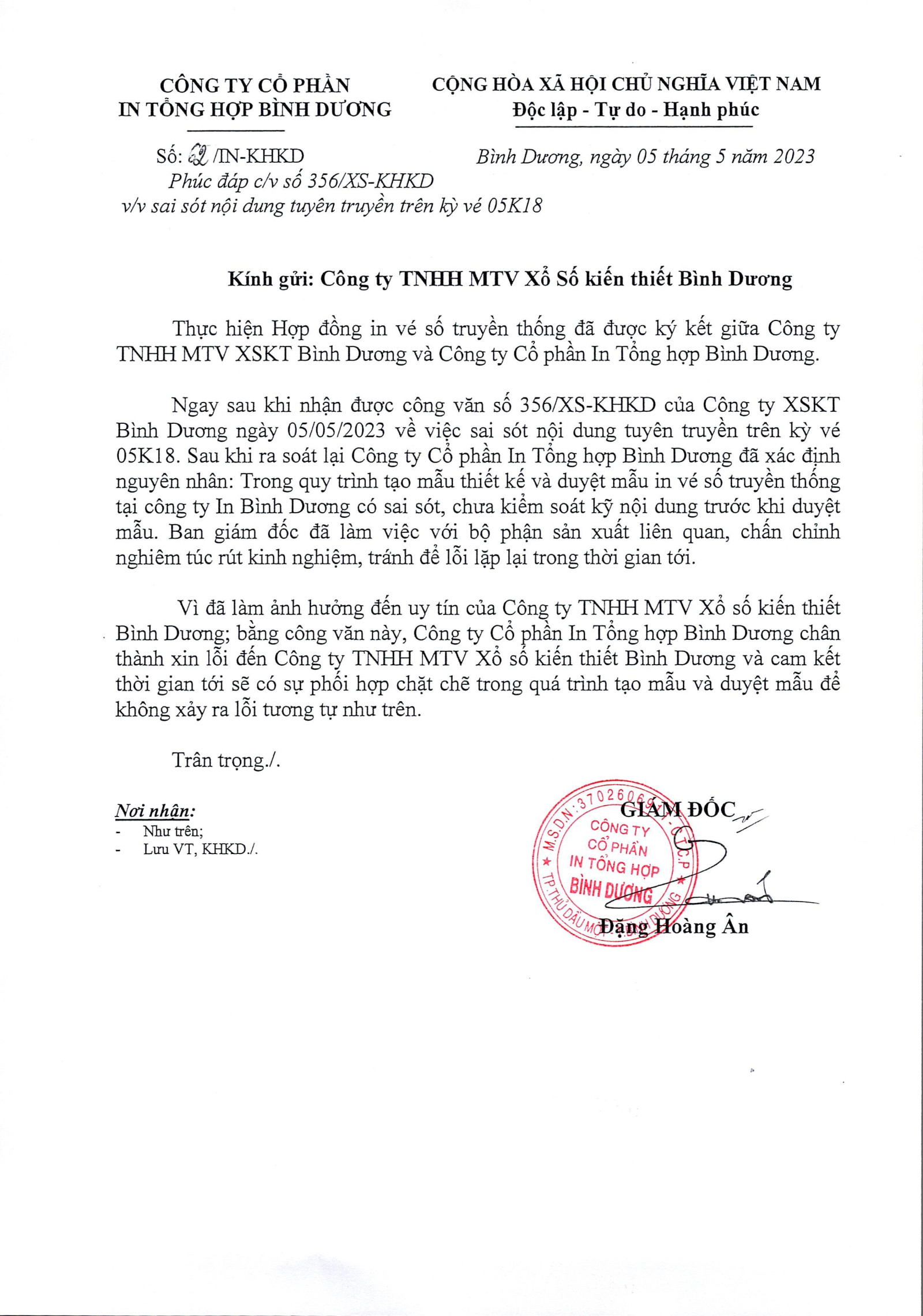 (BDO)Ngày 5-5, Công ty TNHH MTV Xổ số kiến thiết Bình Dương đã có Công văn số 357/XS-TCTH về việc sai thông tin tuyên truyền kỳ vé số ký hiệu 05K18, mở ngày 5-5-2023; Công ty in tổng hợp Bình Dương có Công văn số 62/In-KHKD phúc đáp Công văn số 356/XS-KHKD về việc sai sót nội dung tuyên truyền trên kỳ vé 05K18.