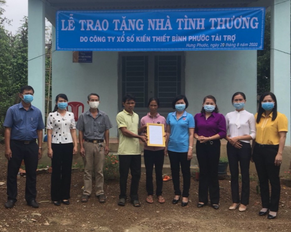 Công ty TNHH MTV Xổ số Kiến thiết và Dich vụ tổng hợp Bình Phước phối hợp với Hội Liên hiệp Phụ nữ tỉnh Bình Phước, Hội Bảo trợ người khuyết tật, trẻ mồ côi và bệnh nhân nghèo và UBND thị trấn Thanh Bình, UBND xã Phước Thiện, UBND xã Hưng Phước, huyện Bù Đốp, tỉnh Bình Phước đãtổ chức lễ bàn giao 03 căn nhà tình thương cho 03 hộ gia đình thuộc diện hộ nghèo, gặp khó khăn về nhà ở trên địa bàn huyện.