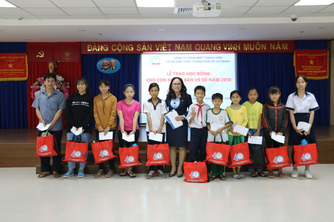 Bà Phan Thị Sang, Phó Tổng Giám đốc Công ty XSKT TP. Hồ Chí Minh trao học bổng cho con người bán vé số
