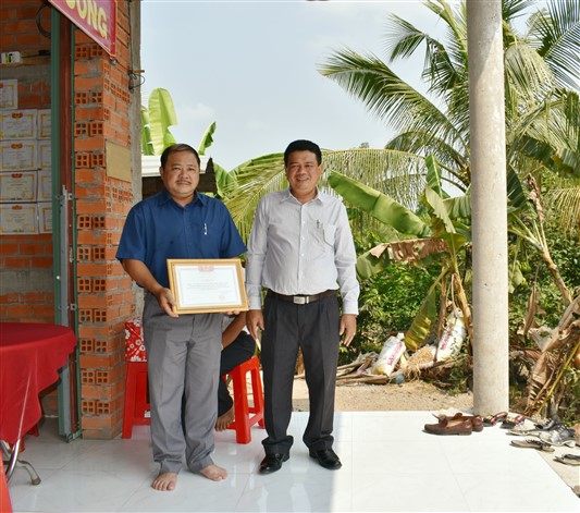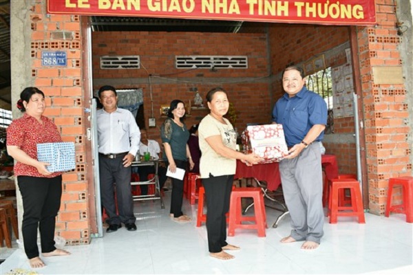 Ông Ngô Thanh Trí trao quà chúc mừng gia đình có được nhà mới khang trang