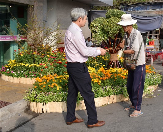 Ông Lưu Hoàng Tân, Chủ tịch kiêm Giám đốc Công ty chúc Tết và trao phần quà cho người bán vé số