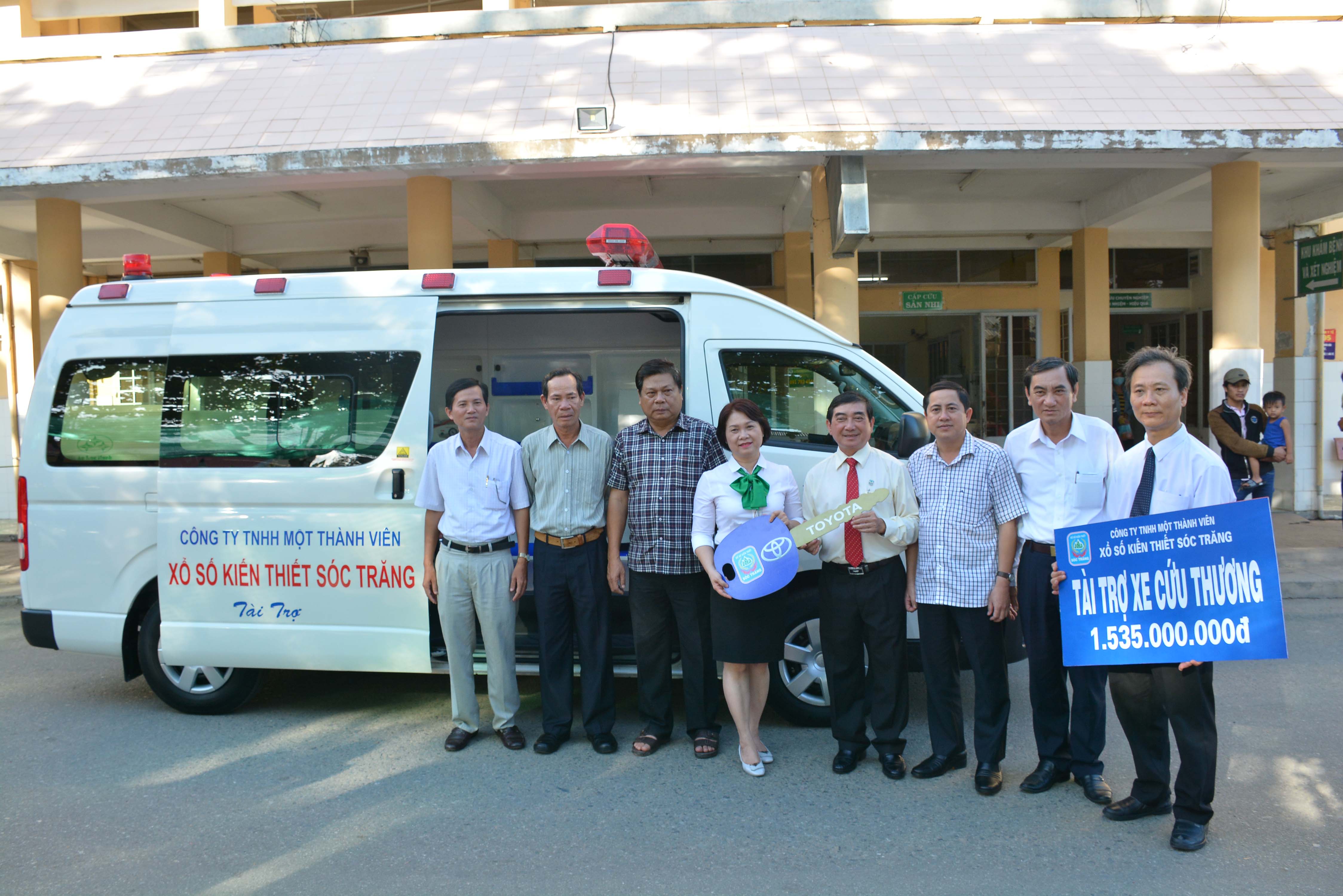 Đại diện Công ty Xổ số kiến thiết Sóc Trăng, ông Lê Văn Khanh – Giám đốc Công ty đã trao tặng 1 xe cứu thương hiệu Toyota – Hiace cho Bệnh viện, tổng giá trị là 1.535.000.000 đồng, xe nhập khẩu từ Nhật Bản, với nhiều trang thiết bị y tế hiện đại, công nghệ cao; thiết kế xe phù hợp với điều kiện địa hình tại Sóc Trăng.