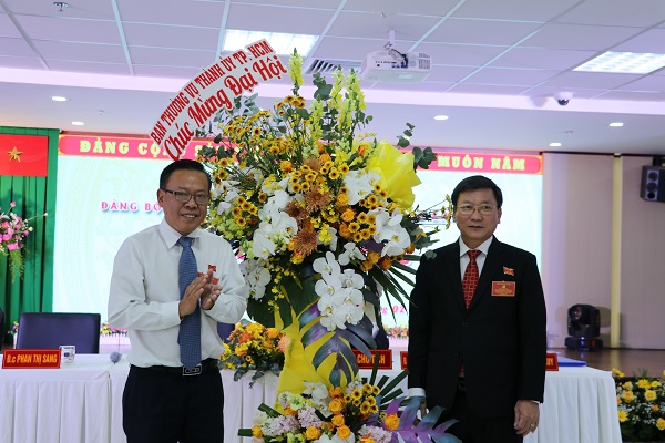 Đ/c Nguyễn Hữu Hiệp - Thường vụ Thành ủy, Trưởng ban Dân vận Thành ủy Tp. Hồ Chí Minh tặng hoa chúc mừng Đại hội.