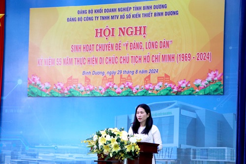 Đồng chí Nguyễn Thị Kim Mai - Bí thư Đảng ủy Công ty phát biểu chia sẻ về tầm quan trọng của Di chúc Chủ tịch Hồ Chí Minh trong sự nghiệp cách mạng của đất nước. Đồng chí nhấn mạnh rằng, Di chúc không chỉ là một văn kiện lịch sử vô giá mà còn là kim chỉ nam cho hành động của cán bộ, đảng viên; kêu gọi toàn thể cán bộ, đảng viên và nhân viên Công ty tiếp tục học tập và làm theo tư tưởng, đạo đức, phong cách Hồ Chí Minh, nỗ lực, quyết tâm hoàn thành tốt các nhiệm vụ mà Nghị quyết Đại hội Đảng bộ Công ty lần thứ XVII đã đề ra.