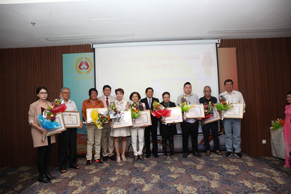Ông Trần Văn Lắm – Bí thư Đảng ủy, Chủ tịch Công ty và ông Võ Trung Dũng – Giám đốc Công ty trao bằng khen của Chủ tịch Ủy ban nhân dân tỉnh An Giang và hoa cho các đại lý