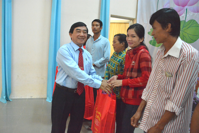 Ông Lê Văn Khanh - Giám đốc Công ty TNHH một thành viên Xổ số kiến thiết Sóc Trăng trao quà cho các hộ gia đình được tài trợ xây dựng nhà đại đoàn kết