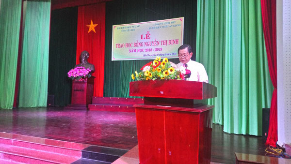 Ông Trần Văn Lắm - Giám đốc Công ty TNHH MTV Xổ số kiến thiết An Giang, phát biểu tại lễ trao học bổng
