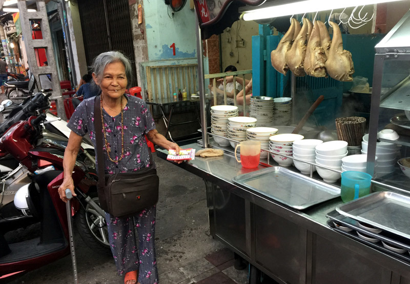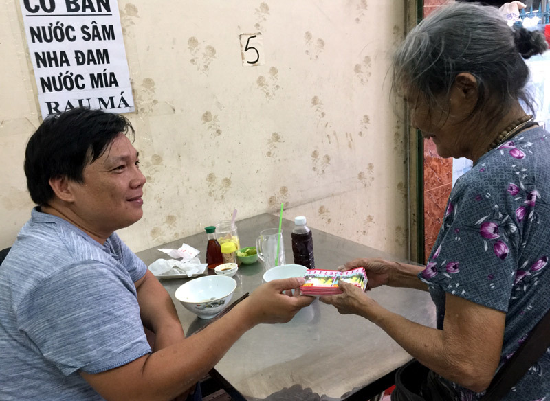 Khách vào càng lúc càng đông. Bà đứng dậy nhường chỗ cho khách. Chúng tôi cũng đã ăn xong, mua giúp bà vài tờ vé số rồi đi.