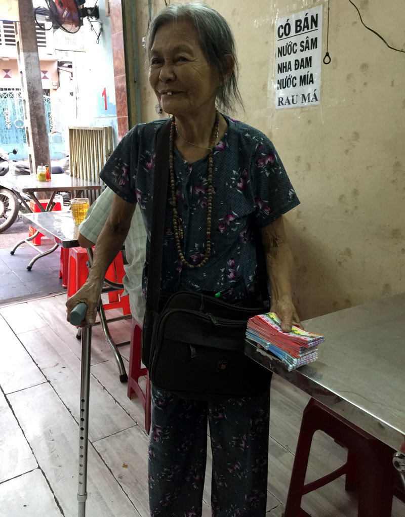 Dường như bà bắt đầu có "cảm tình" với tôi bởi tôi đã đoán ra được quê hương của bà. Bà nở nụ cười. "Năm nay tôi 86 tuổi, vào Sài Gòn bán vé số đã 15 năm. Tôi không còn sức đi bán dạo mà chỉ quanh quẩn sáng ở một tiệm phở trên đường Hòa Hảo và chiều thì ở đây. Tôi bán trong tiệm đỡ phải lo bị giựt vé số", bà chia sẻ.
