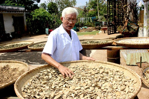 Lương y Lô Quốc Hợi đang phơi các loại thuốc mà ông bào chế.