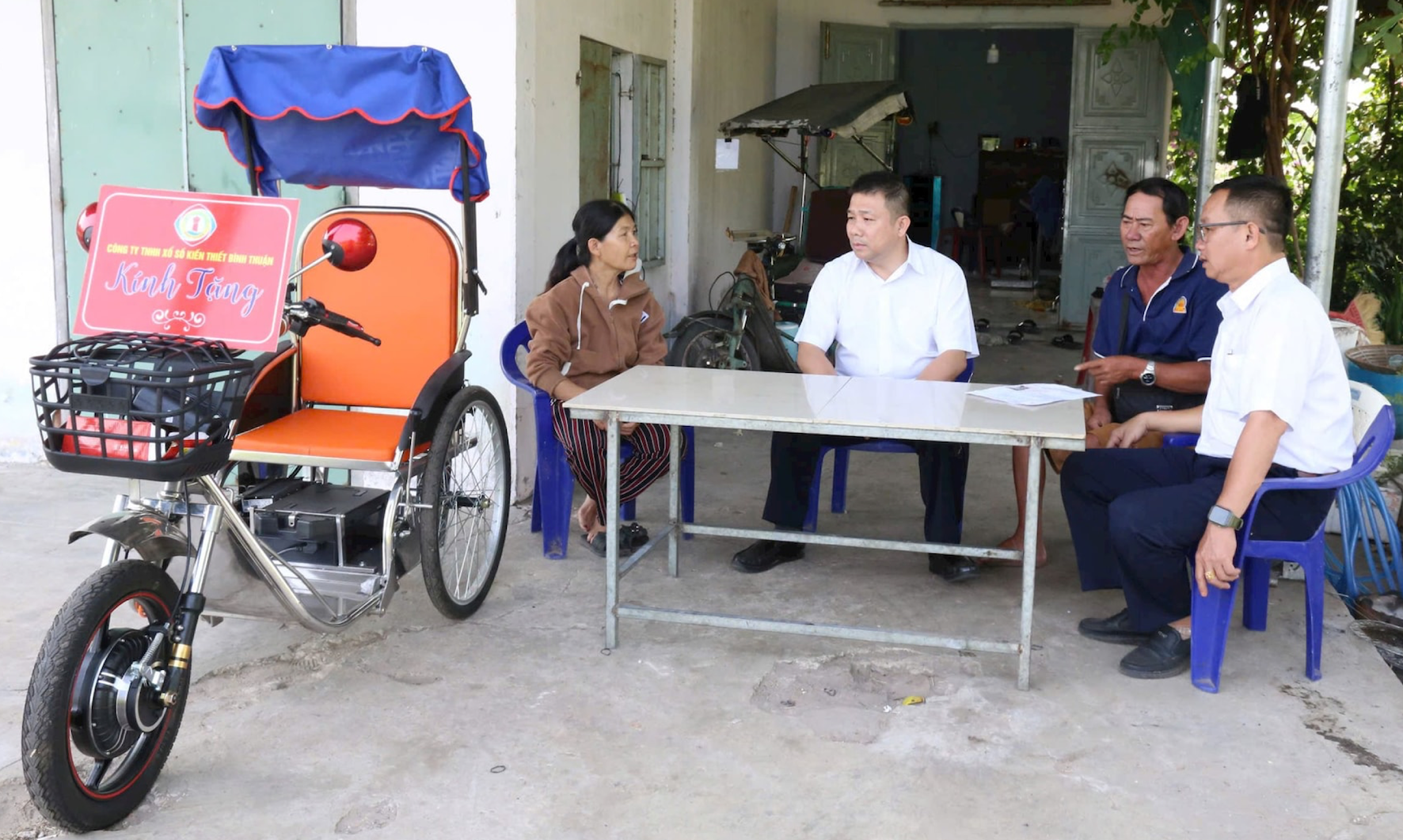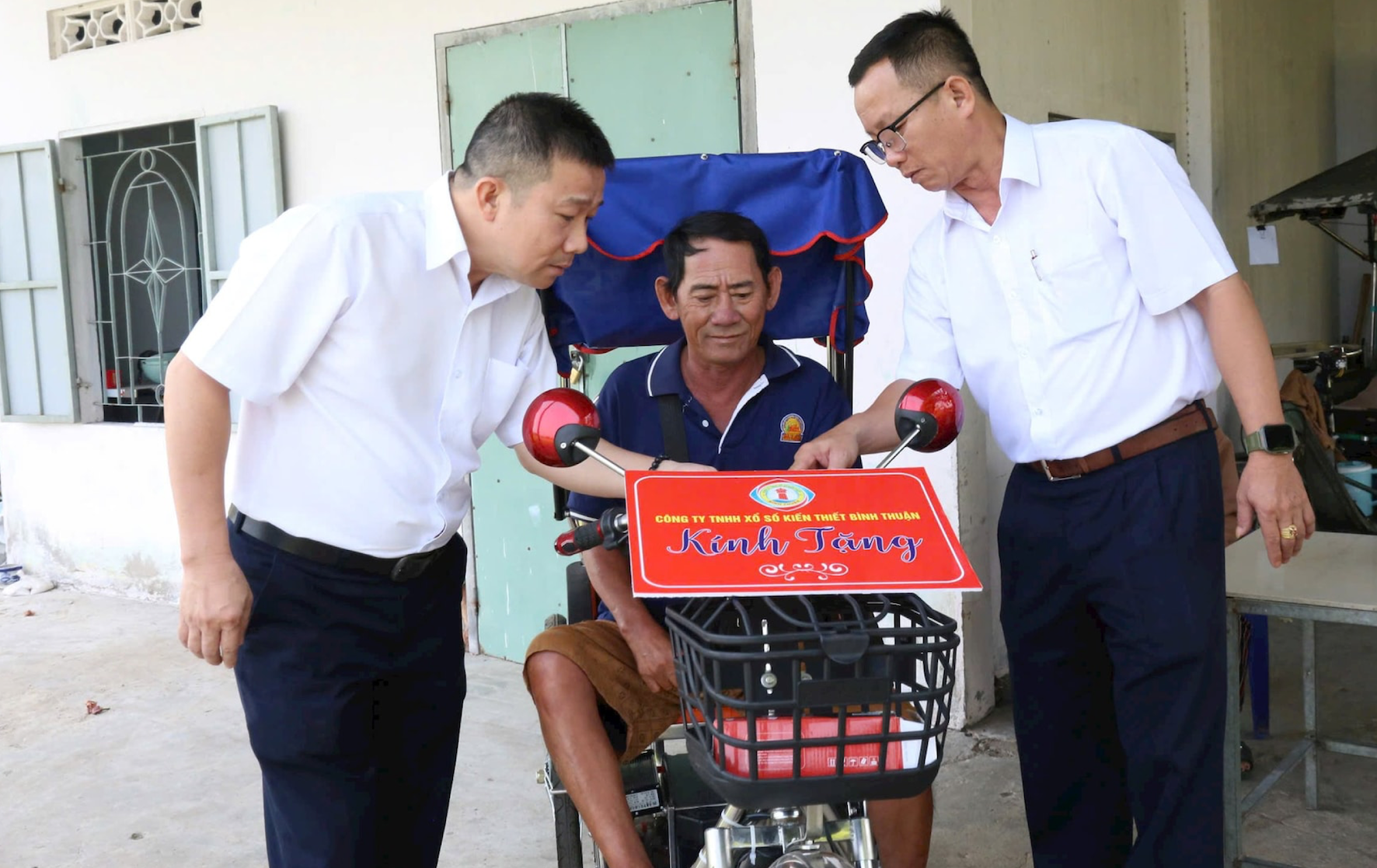 Khi có thông tin về hoàn cảnh ông Tiến là hộ nghèo, có hoàn cảnh khó khăn lại bị bệnh, Công ty TNHH MTV Xổ số Kiến thiết Bình Thuận đã quyết định tặng ông Tiến một chiếc xe lăn điện với giá 17,4 triệu đồng.Đây là món quà hết sức ý nghĩa, giúp ông Tiến cải thiện khả năng vận động, di chuyển, thuận tiện trong việc mưu sinh để mang lại thu nhập, ổn định cuộc sống.