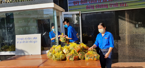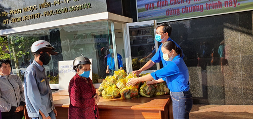 Các bạn đoàn viên đại diện công ty trao quà đến bà con chia sẻ trong phòng, chống dịch Covid-19.