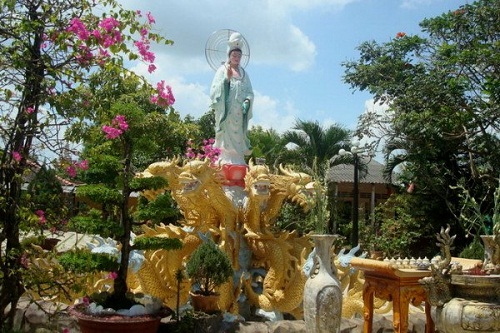 Tượng Phật Bà trong khuôn viên chùa Tiên Châu với 9 con rồng phục quanh bên dưới đài sen