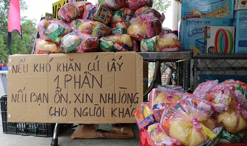 Trên đường phố xuất hiện rất nhiều điểm để sẵn những phần lương thực, thực phẩm miễn phí cho người bán vé số dạo, người nghèo, người vô gia cư…