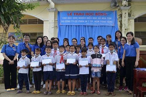 >Sáng ngày 16/6/2022, Chi đoànCông ty Xổ số kiến thiết Trà Vinh phối hợp vớiChi đoàn Công ty Cổ phần In số 7 đến trao học bổng và tặng tập cho các em học sinh tại xã Hòa Tân và xã An Phú Tân. Tham gia cùng Đoàn công tác còn có Đại diện Đảng ủy, Lãnh đạo, Công đoàn của 02 Công ty. Đoàn đã trao tặng 80 suất học bỏng với tổng giá trị là 80.000.000 đồng (do Công ty Cổ phần in số 7 tài trợ). Ngoài ra, Chi đoàn Công tyXổ số kiến thiết Trà Vinh trao tặng 80 phần tập, tương ứng với 800 quyển.