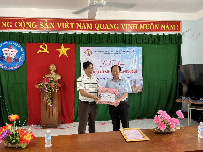 Nằm trong hoạt động chào mừng Đại hội Chi bộ trực thuộc Đảng bộ Công ty TNHH Xổ số kiến thiết Bình Thuận. Ngày 25/06/2022, Chi bộ phòng Tài chính - Kế toán, Công ty Xổ số kiến thiết Bình Thuận tổ chức đi thăm tặng quà cho các em học sinh có hoàn cảnh khó khăn tại trường Tiểu học và trung học cơ sở Hồng Phong thuộc xã Hồng Phong, Huyện Bắc Bình, tỉnh Bình Thuận với tổng trị giá 10 triệu đồng.