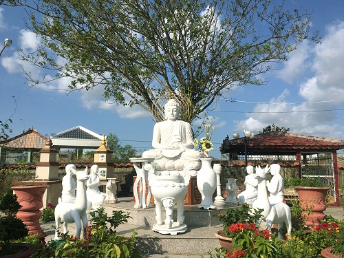 Tượng Phật Quán Thế Âm Bồ Tát màu lam ngọc ngự trên đài sen trước chùa
