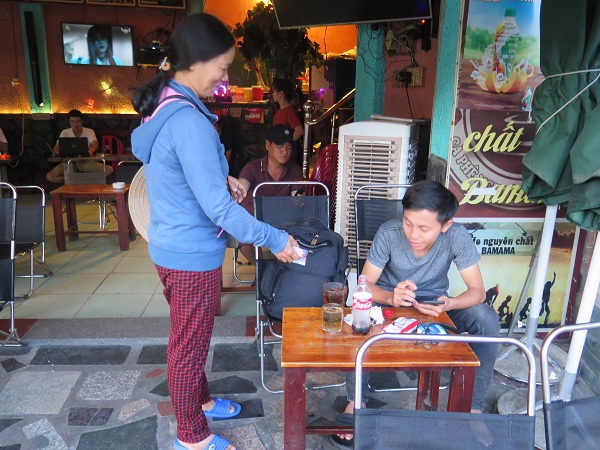 Chị Phan Thị Ngọc, quê Sơn Tịnh (Quảng Ngãi) mới ngoài 40 tuổi, dáng người nhỏ mảnh khảnh, gương mặt sạm nắng vẻ khắc khổ, nhìn già hơn nhiều so với tuổi. Bằng chất giọng rặt âm sắc xứ Quảng chị chia sẻ, ở ngoài quê chị có 2 sào ruộng, quanh năm cặm cụi cày cấy gieo trồng, gặt hái “bán mặt cho đất, bán lung cho trời” may mắn lắm cũng chỉ giải quyết được đủ gạo ăn, còn tiền học phí cho các con thì bó tay, nhiều khi cứ phải vay mượn “giật gấu vá vai”, nên không thoát được cảnh nghèo túng. Muốn có đồng ra đồng vào lo cho con cái ăn học nên người thì không thể cứ bám lấy ruộng đồng được. Năm 2008, sau nhiều đêm suy tính, bàn bạc rồi được chồng đồng thuận, chị quyết định theo những người cùng làng, cùng xứ vào Sài Gòn hành nghề bán vé số đạo từ đó tới giờ cũng đã tròn 10 năm.