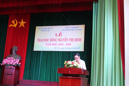 Ngày 08/09/2019 vừa qua, Hội Liên hiệp Phụ nữ tỉnh Bến Tre, phối hợp cùng Công ty TNHH MTV Xổ số Bến Tre và An Giang, tổ chức lễ trao học bổng Nguyễn Thị Định cho học sinh, sinh viên nghèo hiếu học, trên địa bàn tỉnh Bến Tre, do Công ty TNHH MTV Xổ số Kiến thiết An Giang tài trợ,trong chương trình tài trợ đối ứng học bổng, giữa Công ty TNHH MTV Xổ số Kiến thiết An Giang và các công ty xổ số kiến thiết trong khu vực.
