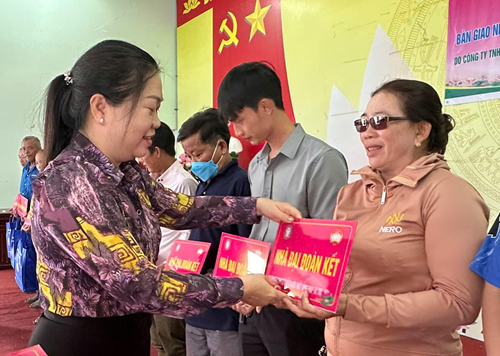 Bà Kiều Thị Mỹ Trinh – Phó Giám đốc Công ty TNHH MTV Xổ số kiến thiết Đồng Tháp trao tặng bảng tượng trưng nhà Đại đoàn kết cho các hộ dân tại buổi lễ bàn giao