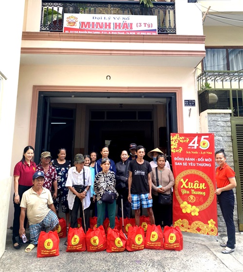 BàNguyễn Thị Kim Mai(áo màu đỏ bên trái)- Chủ tịch Công ty và bàNguyễn Thị Thùy Hương– Trưởng phòng Kế hoạch kinh doanhCông ty (áo màu cam) trao tặng quà cho người bán vé số lẻ tại thành phố Hồ Chí Minh.